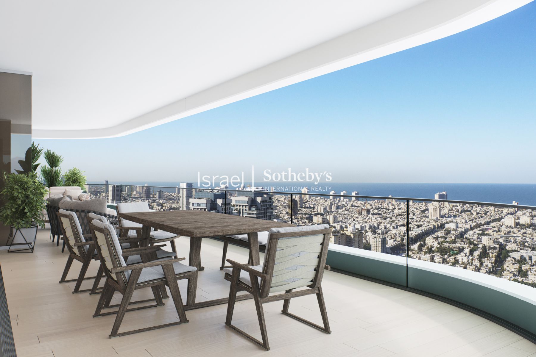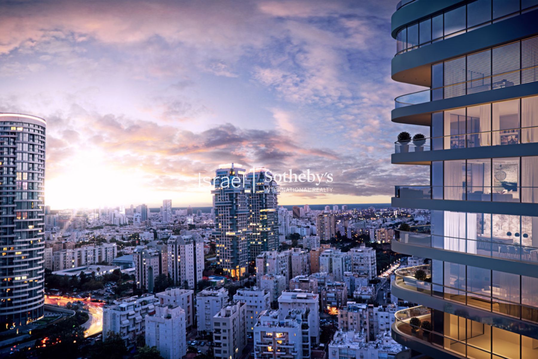 The unique Y-shaped configuration of the tower affords a view from the balcony, from the seventh floor upwards, of the green expanses of Hayarkon Park its entirely and a magnificent urban view of Tel Aviv and of the blue waters of the Mediterranean Sea.