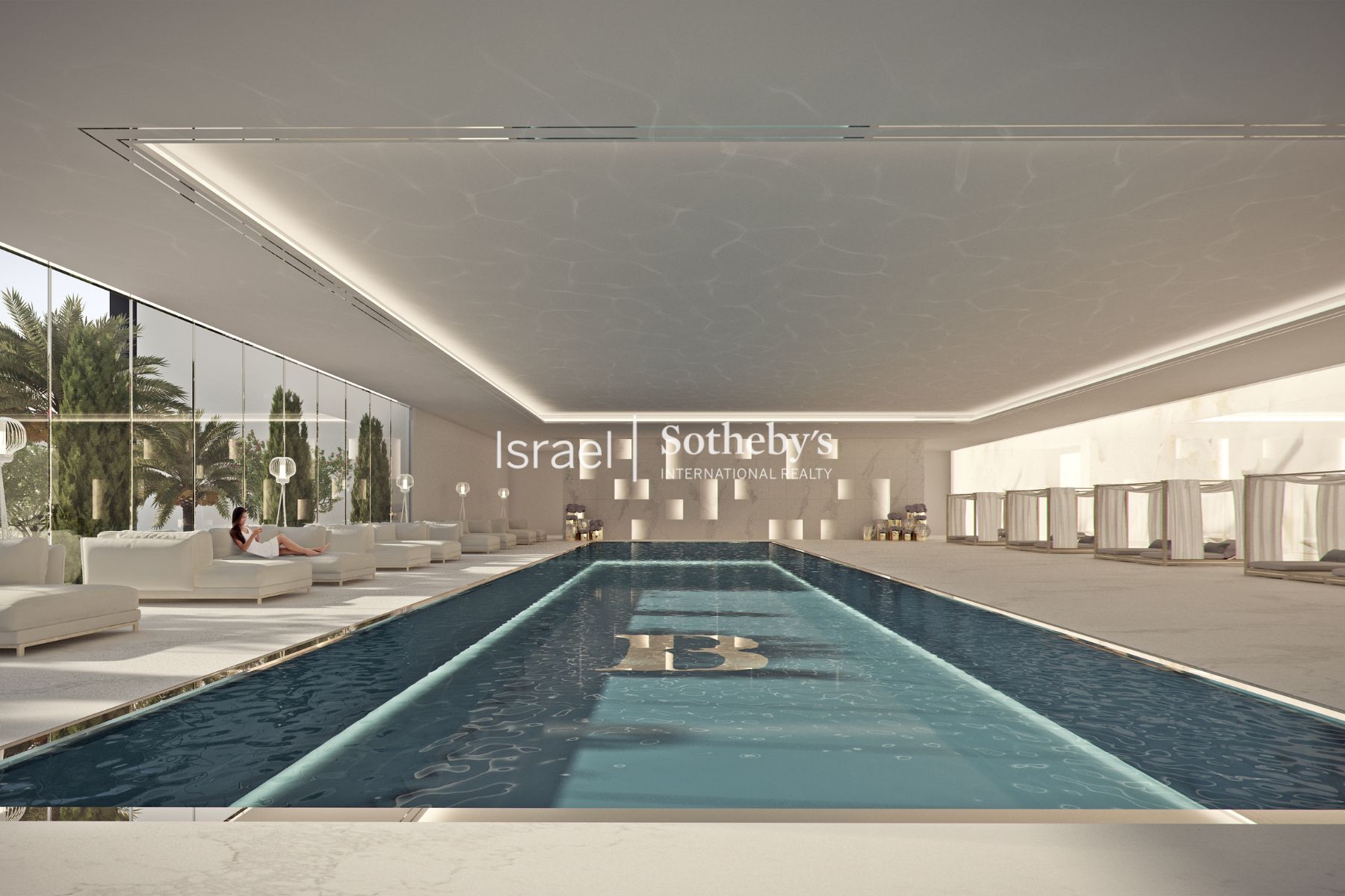 At Beresheet Bavli Tower we designed a private covered pool for you, including a retractable glass wall overlooking a green garden and pleasant sitting spaces in the expansive poolside areas.